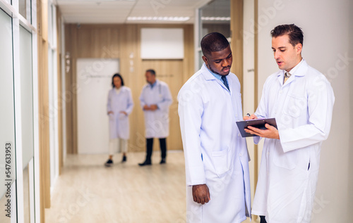 Group of professional medical doctor team work with stethoscope in uniform working discussing and talk together walking in hospital.health insurance medical care concept
