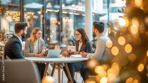 business, meeting, professional, discussion, teamwork, collaboration, office, corporate, festive, christmas, decoration, light, blurred, bokeh, holiday, winter, copy, space, warm, tone, casual attire, attire, elegant, interior, glasses, wall, sharpened, bright, colourful, mood, eatery, cafes