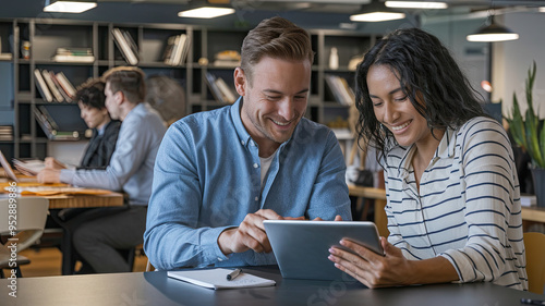 Group of Professionals in a Modern Office Setting Engaged and Smiling While Reviewing Information on a Tablet, Showcasing Collaboration, Technology, and Positive Work Environment