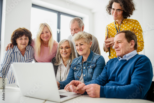 caucasian, active, portrait, senior, old, age, elderly, 60s, pensioner, retired, generation, adult, people, group, man, woman, male, female, student, teacher, tutor, instructor, education, learn, study, school, college, class, classroom, workshop, computer, tablet, technology, modern, cyberspace, support, guidance, sitting, table, desk, cheerful, happy, skill, indoor, inside
