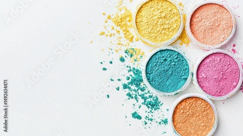 group, small, round, container, eyeshadow, different, colours, arranged, scattered, styled, white, background, eyeshadow, yellow, orange, pink, blue, green, turquoise, powder, finely, textured, surface, aesthetic, bright, vibrant, diversity