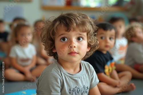 Group of small nursery school children sitting on the floor indoors in a classroom, engaged in learning activities and fostering creativity, Generative AI