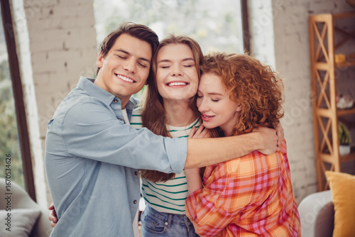 hugging, cuddling, friends, three, people, together, friendship, human relationships, young, group, student, female, woman, woman, girl, girlfriend, male, man, boyfriend, diversity, multinational, comfort, home, casual attire, style, living, room, apartment, flat, dorm, leisure, lifestyle, weekend, vacation, holiday, relaxing, resting, beautiful, natural, light, happy, smile, bonding, cosy, indoor, cheerful, friendly, funny, dorm