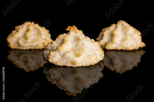 Group of three whole homemade golden coconut biscuit isolated on black glass