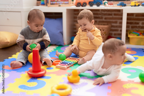 Group of toddlers playing with toys sitting on floor at kindergarten