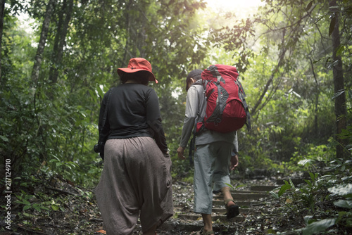 Group of Trekking in rainforest jungle. adventure and explorer concept.