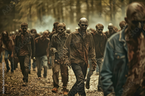 Group of undead zombies wandering through a foggy forest, showcasing eerie expressions and tattered clothing, embodying the Halloween horror theme and atmosphere