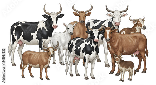 Group of Various Cattle Breeds on Transparent Background Illustrating Diverse Coat Patterns and Colors Suitable for Design and Illustration