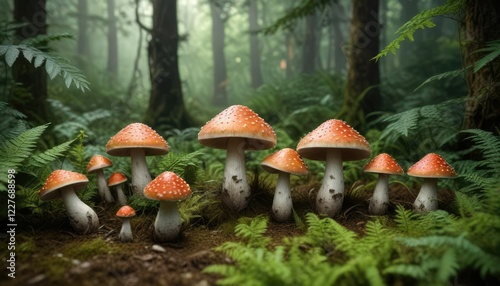 Group of whimsical toadstools in a circle surrounded by ferns, fairy ring, magical