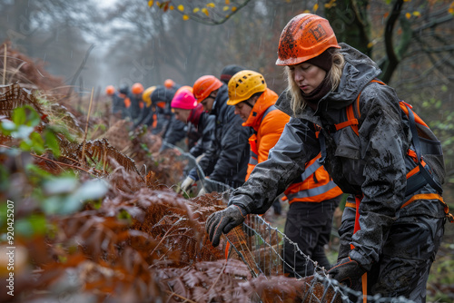 men at work, forest, rainy, installation, fenced, teamwork, wet, weather, labor, determination, autumn, safety, construction, orange, helmet, jacket, collaboration, job, nature, timberland, line, concentration, environmental, dedication, task, uniform, rural, misty, hard work, practical, seasonal, tool, effort, endurance, worksite, landscape, crew, working, challenging