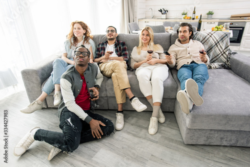 Group of young friends relaxing on couch in living-room while having red wine