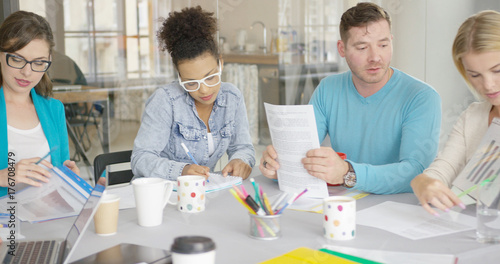 Group of young people concentrated on work with papers and documents while sitting at table in office.