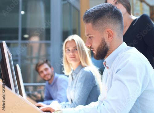Group of young people in casual wear sitting at the office desk and discussing something while looking at PC together.