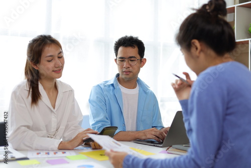 Group of young startup entrepreneurs have a brainstorming meeting to discuss marketing strategies for business growth and analyze investments.