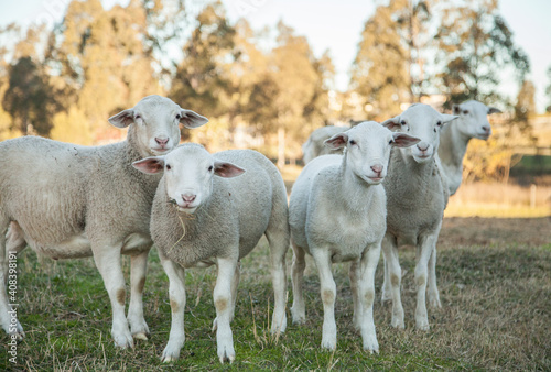 group, young, white, sheep, looking, camera, farm, farming, rural, country, outside, shade, meat, male, winter, morning, copy space, lamb, wool, flock, ewe, wooly, jampacked