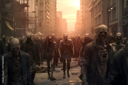 group of zombie walking slow at the city street at sunny morning or evening. Neural network generated image. Not based on any actual person, scene or pattern.