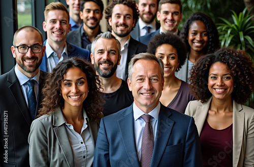 group, portrait, diverse, people, all, dressed, formal, business, attire, they, are, standing, room, with, large, window, and, plant, background, arranged, semi, circle, facing, camera, smiling, appear, different, age, some, them, wearing, suit, tie, while, other, casual attire