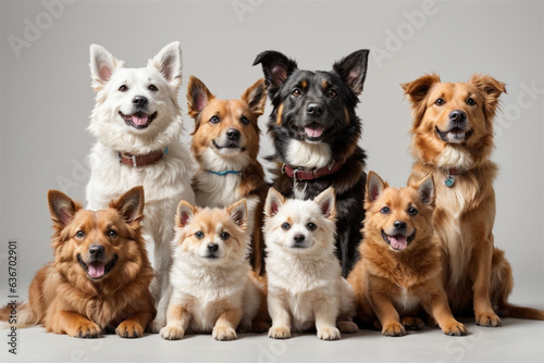 Group portrait of dogs of various shapes, sizes, and breeds. Stray pets with happy expression waiting for adoption. generative AI