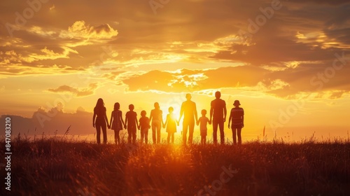 group, people, field, sunset, outdoors, friends, gathering, together, nature, silhouette, friendship, smiling, happy, oneness, community, bonding, connection, warm, gold, light, hours, camaraderie, companionship, team, family, reunion, celebration, relaxation, peace, calmness, harmony, meadow, greenery, tree, wind, movement, breeze, sky, cloud, warmth, joy, hope