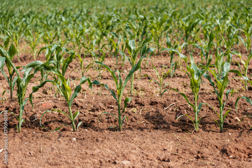 corn, agricultural, field, nature, crop, farming, spring, plant, green, rural, growth, season, summer, environment, grain, grass, organic, landscape, maize, food, row, land, fresh, growing, harvest, leaf, young, countryside, country, dirtied, ground, industry, germ bud, cultivated