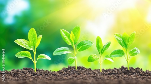 Growth of green seedlings in sunlight nature. Plants sprout from soil, leaves reach sunlight. Agriculture and environment, fresh natural field, rural landscape, eco health, organic development.