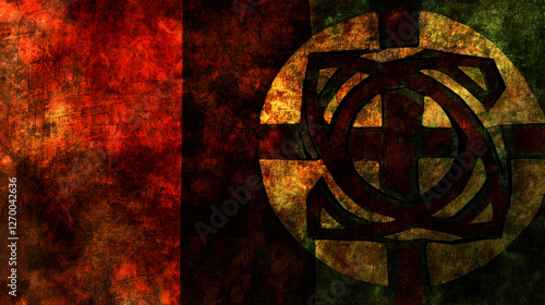 flag, celtic, grunge, burning, background, design, texture, abstract, pattern, fire, ireland, scotland, wales, history, heritage, culture, ancient, symbol, myth, legend, tradition, art, graphic, image, illustration, vintage, retro, rustic, mediaeval, fantasy, gothic, dark, red, green, brown, black, wallpaper, banner, poster, element, photo