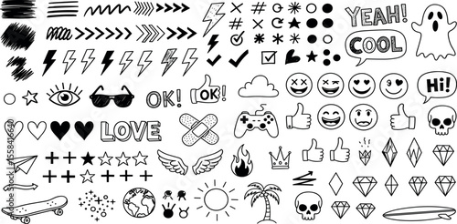 doodle, vector, icon, hand-drawn, grunge, arrow, symbol, smiley, vignetting, sticker, design, cool, illustration, lightning, star, nubes, crown, thumb up, peace sign, skull, ok, flames, wave, surf, diamond, underline, sketchy, brush, casual attire, fun, expressive, teenage, trendy, bold, element, drawing, hand, art, line