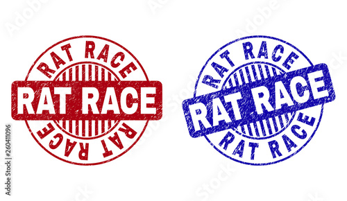 Grunge RAT RACE round stamp seals isolated on a white background. Round seals with grunge texture in red and blue colors. Vector rubber watermark of RAT RACE title inside circle form with stripes.