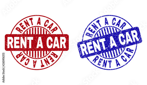 Grunge RENT A CAR round stamp seals isolated on a white background. Round seals with grunge texture in red and blue colors. Vector rubber imprint of RENT A CAR label inside circle form with stripes.