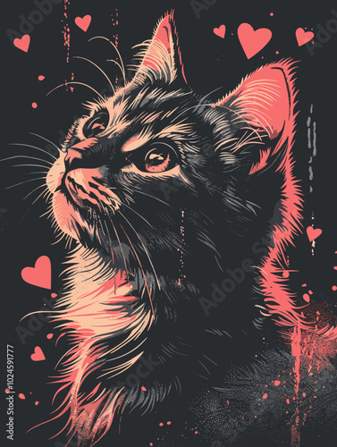 Grunge sketch of a cat with hearts. Vector illustration.