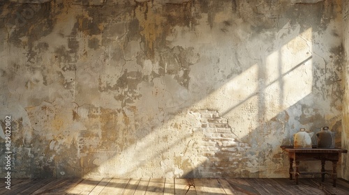 Grunge wall in a daylight-filled living room, showcasing ancient ambiance