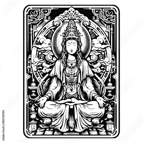 Guan Yin goddess inside tarot card in black and white illustrations, cutout graphic