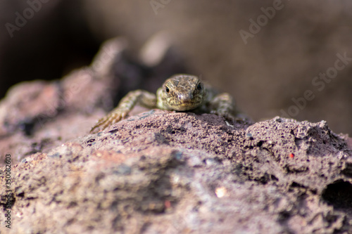 Gut getarnte Eidechse auf Stein in freier Wildbahn kriecht durch ihr Revier auf Nahrungssuche und nimmt ein Sonnenbad zum Aufwärmen vor der Jagd wechselwarmes Reptil mit Schuppen und langem Schwanz