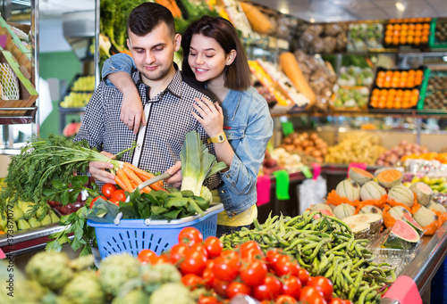 Guy and girl are deciding on vegetables in grocery shop.