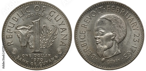 Guyana Guyanese coin 1 one dollar 1970, subject Berbice revolt, digit of denomination in front of cow head and grain stalks, head of Cuffy left,