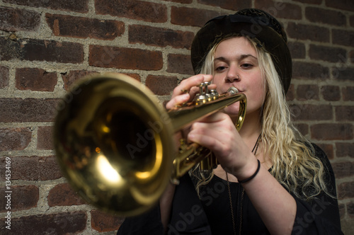 trumpet, horn, musician, instrument, brass, silk hat, music, playing, band, gypsy, brick, wall, street, alley, performer, blond, girl, pretty, beautiful, attractive, young, lady, woman, rust-eaten, stylish, silly, hipster, jazz, curly, hair, vagabond, tramp, bum, bum, vagrant, homeless, outdoors, live, entertainment, entertaining, female, skirt, fancy