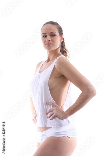 woman, fitness, athletic, sport, muscle, belly, flat, trained, sexy, girl, adult, caucasian, young, female, pretty, beauty, attractive, top, hot pants, white, release