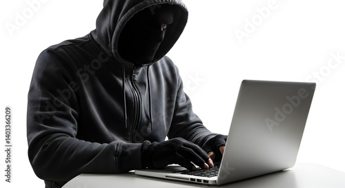 Hacker in Dark Hoodie and Mask Typing on Laptop Computer Against a White Background