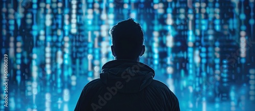 hacker over a screen with binary code. Copy space image. Place for adding text or design
