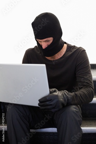 man, male, caucasian, cut-out, isolated, technology, hacking, hacker, criminal, illegal, crime, stealing, identity theft, serious, stern, unsmiling, frowning, using, typing, laptop, notebook, computer, wireless, glove, balaclava