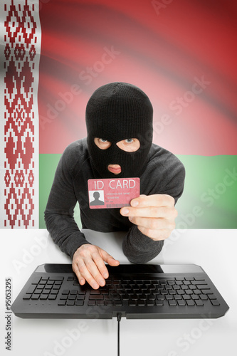 Hacker with flag on background holding ID card in hand - Belarus