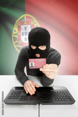 Hacker with flag on background holding ID card in hand - Portugal