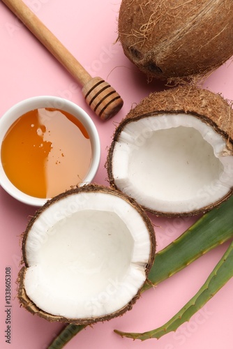 Hair treatment. Fresh coconut, honey and aloe leaves on pink background, flat lay