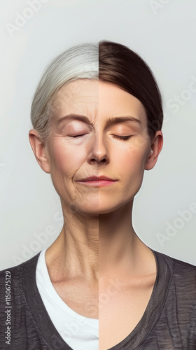 expression, portrait, contrast, face, woman, hair, young, lifestyle, health, harmony, youth, beauty, graphic, visual, brown, eye, skin, old, identity, symmetry, smooth, grey, ageing, wrinkle, comparison, transformation, age, half, duality, feminine, merge, closed, skincare, transition, balance