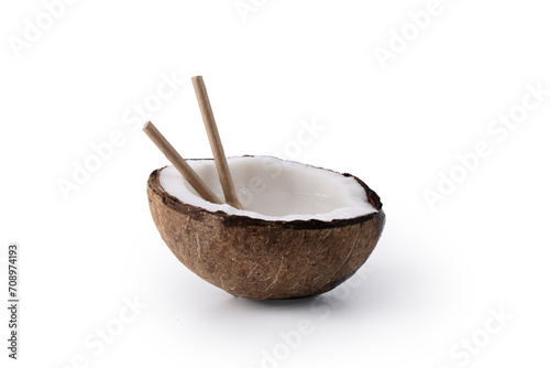 Half of coconut with coconut water on white background. Tropical summer healthy coconut cocktail.