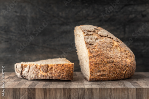Half of rye bread and a piece on the table