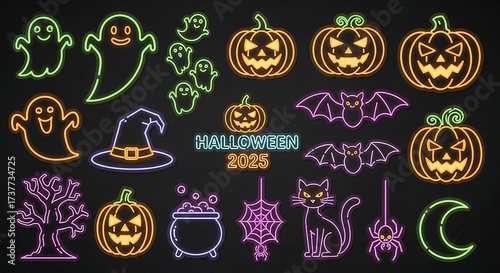 halloween 2025 neon icons spooky ghosts pumpkins bats cat spider and a witchs hat for a festive halloween celebration concept
