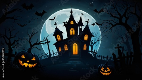 halloween, moon, night, house, castle, bat, holiday, haunted, pumpkin, vector, skittish, autumn, tree, horror, silhouette, illustration, bat, dark, scarey, cartoon, october, cemetery, celebration, design, black