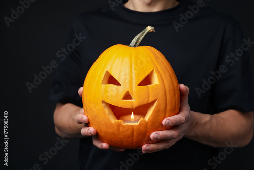 Halloween celebration. Man with jack o'lantern pumpkin on black background, closeup