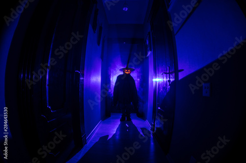 Halloween concept. Creepy silhouette in the dark corridor with pumpkin head. Toned light with fog on background. Selective focus